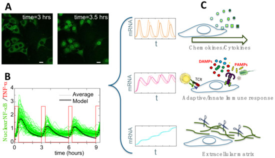 The presence of at least two strong negative feedback loops provides both system flexibility and a tight dynamical control of the response to external stimuli. As a consequence of this sensitive wiring, a constant stimulation with inflammatory stimuli translates in oscillations of nuclear NF-κB concentrations that were first observed via microscopy almost 15 years ago [8] and then in a variety of studies (revised in [9]). Importantly, it has been demonstrated that such oscillations are fundamental to modulate gene expression [10,11,12,13] in a functionally relevant way [14], as we will discuss in detail below.