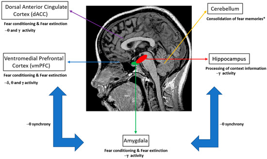 Human brain regions that have been investigated in studies of fear conditioning and fear extinction. Here, we emphasize the relevant neural oscillatory correlates (δ: delta oscillations; θ: theta oscillations; γ: gamma oscillations) of such mechanisms, as suggested by animal and human studies. * Note that the role of the cerebellum in conditioning and extinction of fear is a matter of current research. Nevertheless, functional aspects such as the consolidation of fear memories have been suggested by previous studies [11,12].