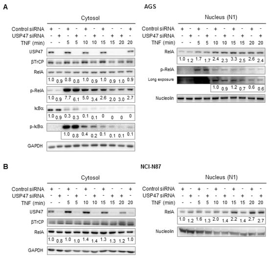 USP47 depletion downregulates protein levels of βTrCP and Ser536-phosphorylated RelA. (A) AGS or (B) NCI-N87 cells transfected with USP47 or a negative control siRNA were stimulated with TNF for up to 20 min. Subcellular fractions were prepared at the indicated time points and NF-κB pathway components analyzed in cytosolic and soluble nuclear fractions (N1). An additional immunoblot with increased signal acquisition time is shown for p-RelA in (A). Detection of GAPDH and nucleolin served as control for equal protein load. For densitometric analysis, band intensities of key proteins were normalized to the band intensities of the respective cytosolic or nuclear loading control. The normalized band intensities are shown below the corresponding blots.
