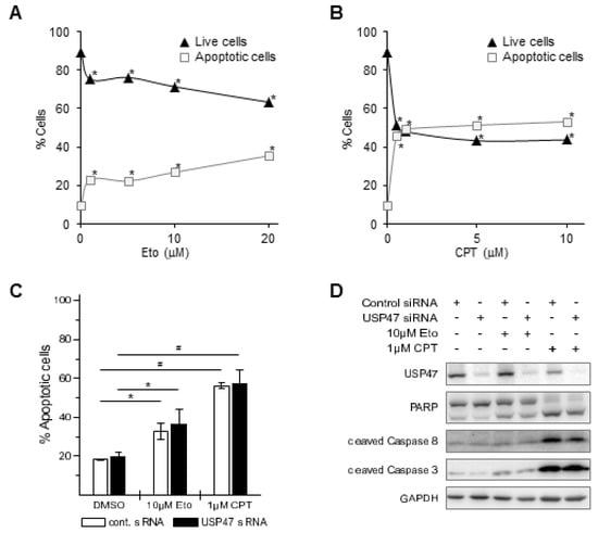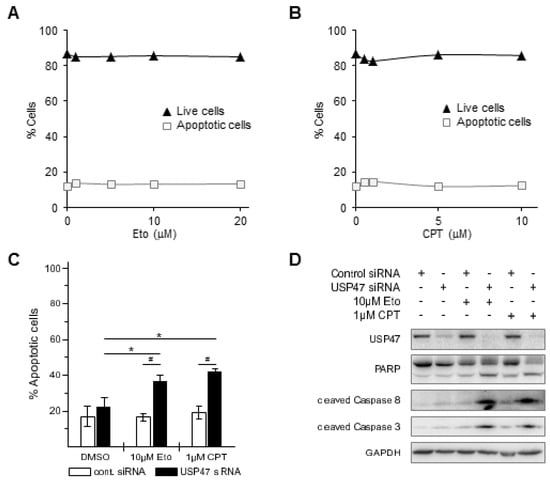 USP47 attenuates etoposide (Eto) or camptothecin (CPT)-induced apoptotic cell death in NCI-N87 cells. NCI-N87 cells were incubated with increasing concentrations of (A) Eto (1–20 μM) or (B) CPT (0.5–10 μM) for 24 h. Live (black triangles) and apoptotic cells (open squares) were counted by flow cytometry using Annexin V staining. Standard deviations are in the range of the marker size; (C) To analyze the effect of USP47 on cell survival, NCI-N87 cells were transfected with USP47 or control siRNA, treated for 24 h with 10 μM etoposide or 1 μM CPT and apoptotic cells were counted by flow cytometry using Annexin V staining. * p < 0.05, # p < 0.001; (D) Whole cell extracts of NCI-N87 cells treated as in (C) were subjected to immunoblotting and analyzed for apoptotic markers. Detection of GAPDH served as control for equal protein load.