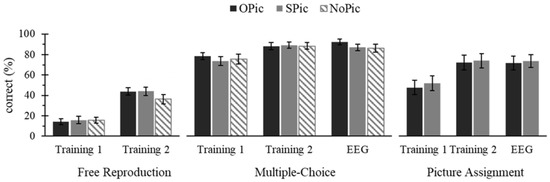 Different questionnaires assessed the participants’ learning performance. A free reproduction task tested the ability to recall the learned words freely after both training sessions. Following each training and the EEG session, a multiple-choice questionnaire with a list of all words tested the participants’ ability to assign the novel words to their category (based on the training condition associated with object, structure and no picture). In an attached picture assignment task, participants were additionally asked to assign each novel word to the printed photographs of the objects/structures. In the learning performance tests, participants could reach one point per correct free reproduction and assignment of the novel words to their category (OPic, SPic, NoPic) or picture (OPic, SPic), respectively. In all versions of the multiple-choice questionnaire, the order of the words was randomized. For each category and learning performance measure, the percentage of correct reproduction and assignments was calculated.