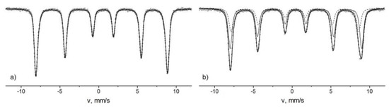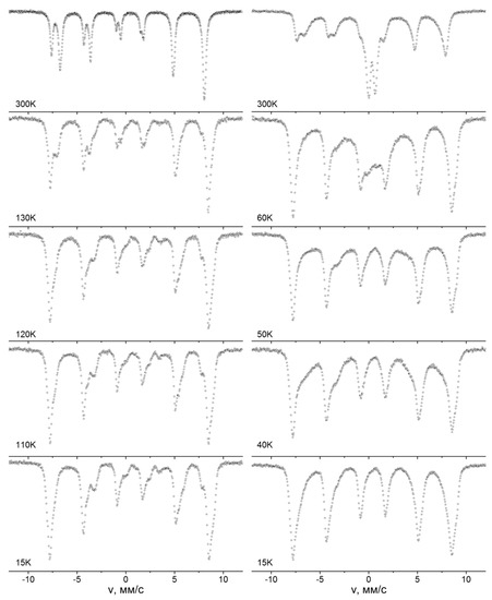 - Chuev, M.A. On the Shape of GammaResonance Spectra of Ferrimagnetic Nanoparticles under Conditions of Metamagnetism. JETP Lett. 2013, 98, 465–470. [Google Scholar] [CrossRef]
