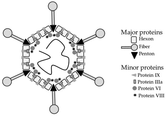 - Vellinga, J.; van der Heijdt, S.; Hoeben, R.C. The adenovirus capsid: Major progress in minor proteins. J. Gen. Virol. 2005, 86 Pt 6, 1581–1588. [Google Scholar] [CrossRef] [PubMed]