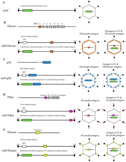 VLP particle-based epitope display has been explored in vaccine development using, for instance, adeno-associated virus (AAV) [] or various other viruses [,,,]. AdV display-vectors have the potential to carry multiple antigens for instance in hexon (e.g., HVR1 and HVR5) or fiber (e.g., HI-loop and FG-loop), or epitope insertion in different capsid proteins (e.g., hexon and pIX). Insertion of multiple epitopes can be exploited to generate single AdV vectors displaying multiple epitopes, or greater numbers of the same epitope per capsid. In addition, AdV display vectors can be engineered to genetically encode an antigen to enhance antigen-specific humoral and cellular responses, combining the benefits of protein and AdV-based vaccines.