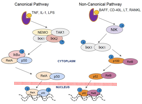The activation of NF-κB through the non-canonical pathway is essential in lymphoid organ development and adaptive immunity [19,20], (Figure 1). This pathway involves a more restricted set of ligands, such as the B-cell-activating factor (BAFF), lymphotoxin-beta (LT-β), and cluster of differentiation 40 (CD40), which can lead to the activation of the NF-κB inducing kinase (NIK) that phosphorylates and activates the IKK1 homodimer, resulting in the phosphorylation of p100 nd the subsequent degradation to p52 [2,20,21]. Upon p100 degradation, the RelB/p50 and RelB/p52 dimers are released and translocated into the nucleus where they start the transcription of the target genes [20,22,23].