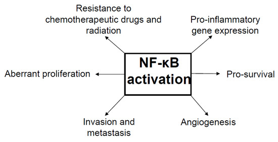 There are numerous studies supporting the involvement of ionizing radiation (IR) in the activation of NF-κB and the development of anti-apoptotic abilities in cancer cells [35,47,48,49,50,51,52,53,54,55,56,57,58,59,60]. IR-induced NF-κB activation has been observed to be initiated by the proteasomal degradation and phosphorylation of IκB by the IKK complex [61].