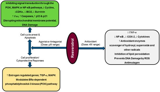 Diagrammatic representation of resveratrol biphasic activity and gene expression modulation. At nanomolar [124] doses, resveratrol acts as a potent antioxidant, while at micromolar (μM) range, it interacts as agonist or antagonist exhibiting cell proliferation/cytoprotective responses or cytostatic/apoptotic effects, respectively.