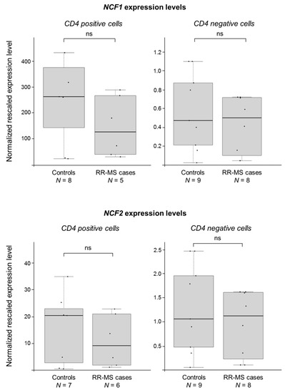 NCF1 and NCF2 do not show any significant difference between MS cases and controls. Boxplots show the expression levels of the NCF1 and NCF2 genes measured by semi-quantitative real-time RT-PCR in CD4+ and CD4− cells (prepared from peripheral blood mononuclear cells, PBMCs). MS cases and controls belong to five multiplex Finnish families (comprising both male and female individuals). Boxes define the interquartile range; the thick line refers to the median. Results were normalized to expression levels of the HMBS and ACTB housekeeping genes and are presented as rescaled values. The number of subjects belonging to each group is indicated (N). The significance level of t-tests was in all cases not significant (ns).