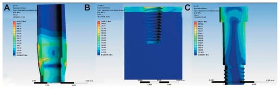 Adapted from [24] with permission of M. Cicciù in 2018. Von Mises and Stress distribution on three different prosthodontics sections; (A) located in the abutment section; (B) stress located at the bone tissue; (C) stress distribution at the passant screw.