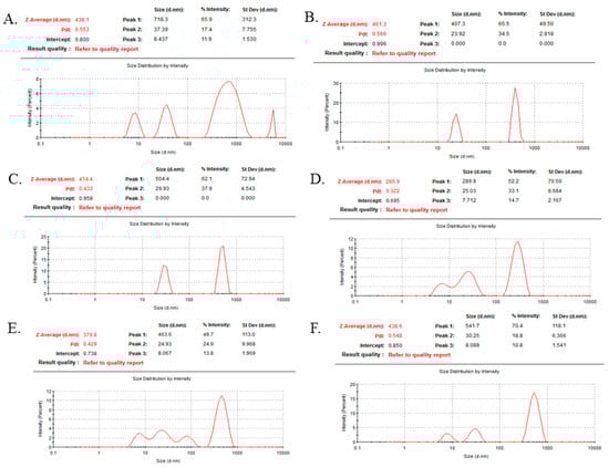 DLS technique is the most popular tool to measure the diameter of particles in suspension [,,] and the stability of the formulation []. Typically, it measures particle size distribution by analyzing the intensity of the scattered light of the sample particles with some limitations of poor accuracy for the larger sized particles and highly polydisperse samples [,,].