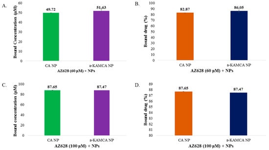 Estimation of AZ628 encapsulation efficacy. (A) Drug binding amount (μM) of CA, α-KAMCA NPs NPs for 60 µM AZ628. (B) Drug binding efficiency (%) of CA, α-KAMCA NPs NPs for 60 µM AZ628. (C) Drug binding amount (μM) of CA, α-KAMCA NPs NPs for 100 µM AZ628. (D) Drug binding efficiency (%) of CA, α-KAMCA NPs NPs for 100 µM AZ628.