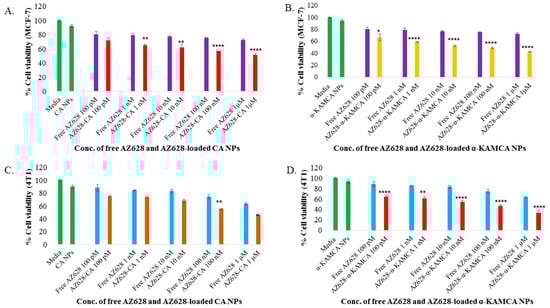 MTT assay of AZ628-loaded CA and α-KAMCA NPs in MCF-7 and 4T1 cell line. (A) Cell viability assessment by MTT assay after 48 h incubation of the free AZ628 and AZ628-loaded CA NPs in MCF-7. (B) Cell viability assessment by MTT assay after 48 h incubation of the free AZ628 and AZ628-loaded α-KAMCA NPs in MCF-7. (C) Cell viability assessment by MTT assay after 48 h incubation of the free AZ628 and AZ628-loaded CA NPs in 4T1. (D) Cell viability assessment by MTT assay after 48 h incubation of the free AZ628 and AZ628-loaded α-KAMCA NPs in 4T1. Values were significant (*) at p-value 0.01 to 0.05, very significant (**) at p-value 0.001 to 0.01, highly significant (***) at p-value 0.0001 to 0.001, extremely significant (****) at p-value < 0.0001 vs. the same treatment of free AZ628 at CI of 95%.