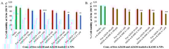The time-dependent anticancer efficacy also was evaluated for free AZ628, AZ628-loaded CA NPs and AZ628-loaded α-KAMCA NPs on MCF-7 at 24 h of treatment (Figure 7). At 1 µM concentration of AZ628, drug-loaded α-KAMCA NPs caused almost 57% (p < 0.001) cell viability (Figure 7B) and drug-loaded CA NPs showed almost 61% (p < 0.01) cell viability (Figure 7A) in MCF-7 cell line, representing approximately 18% and 14% more cytotoxicity compared to the same concentration of free AZ628, respectively.