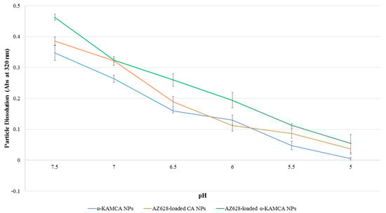 The dissolution profiles of CA NPs and α-KAMCA NPs were assessed at six different pHs of the same buffered media ranging from pH 7.5 to pH 5.0 (Figure 9). In case of apatite-based nanocarriers, pH-responsive drug release is crucial in the target site to avail the substantial toxicity to the cancer cells while lessening the adverse effects to healthy tissues, and to overcome the multidrug resistance [,,,]. In this study, drug release was indirectly measured by analyzing pH sensitivity of the NPs at the acidic environment through turbidity test. Under normal physiological conditions α-KAMCA NPs, AZ628-loaded CA NPs and AZ628-loaded α-KAMCA NPs were stable; however, the phosphate and carbonate ions in the apatite structure could readily accept excess H+ ion from the endosomal acidic microenvironment, causing the particles to be dissolved [] and enabling AZ628 to passively diffuse from endosome to cytoplasm with the result of enhanced drug accumulation in the tumor region and improved therapeutic efficacy.
