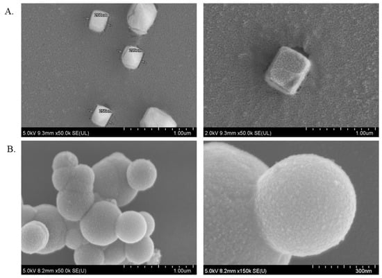 NPs morphology such as shape, size, functional group and organization plays an influential role in determining their physicochemical and functional properties, the cellular uptake, and drug binding and drug delivery to the targeted cells [,]. The morphology of α-KAMCA NPS was characterized by FE-SEM images. As seen in Figure 10A, α-KAMCA NPs had a cube-like shape with an average particle size being around 256–299 nm. The surface of the NPs possessed huge folds, providing a large surface area for the vast amount of drug binding. However, CA NPs owned a uniform spherical shape with comparatively less folding on the surface area than α-KAMCA NPs (Figure 10B), which accounts for the binding of a lower amount of the drug.