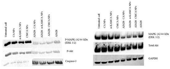MCF-7 cells (~5 × 106 cells) were seeded and incubated at 37 °C in a humidified atmosphere with 5% CO2 for 24 h. After that, the seeded cells were treated with CA NPs, α-KAMCA NPs, CMCA NPs, AZ628-loaded CA NPs, AZ628-loaded α-KAMCA NPs, AZ628-loaded CMCA NPs and free AZ628 for 24 h. CMCA NPs were formulated according to the protocol of our previous study [], however in the current study only CA NPs and α-KAMCA NPs were discussed. After treatment with the free drug, free NPs, and drug-loaded NPs, the cells were incubated for 24 h, followed by the cell detachment and cell lysis at 4 °C by using a lysis reagent (protease inhibitor, phosphatase inhibitor, sodium fluoride & stable stock lysis buffer). The lysed cells were centrifuged at 13,000 rpm for 30 min at 4 °C to collect the proteins from the supernatant. Quick Start Bradford Protein Assay kit (Bio-Rad) was used in estimating the total protein contents in the cell lysates. About 10 μg of total proteins were loaded for SDS-PAGE in stain-free Mini protein TGX gels (Bio-rad, USA) in the 1× running buffer at 50 V for 2 h. Proteins were transferred to a nitrocellulose membrane (Bio-rad, Germany) by wet blotting at 0.35 A for 2 h and the membrane was blocked with 5% skimmed milk in tris-buffered saline along with Tween-20 (1× TBST) for 1 h at room temperature. The membrane was incubated overnight with primary antibodies (T-MAPK, T-Akt, p-MAPK, p-Akt, Caspase-3 and GAPDH as an internal control) at 1:1000 dilutions at 4 °C with gentle shaking. The membrane was washed with TBST (5 × 10 mL) for 5 min each and further incubated with a secondary antibody (Thermo Fisher Scientific, Waltham, MA, USA) at 1:3000 dilution for 1 h at room temperature with gentle shaking. After the incubation with secondary antibody, the membrane was washed with TBST (5 × 10 mL) for 5 min to remove any unbound antibody. The membrane was incubated with a mixture of luminol and peroxide Clarity Western ECL substrate (Bio-rad, USA) at room temperature for 5 min. Protein bands were visualized using Chemidoc XRS Imaging system (Bio-rad, Hercules, CA, USA) following the manufacturer’s protocol.