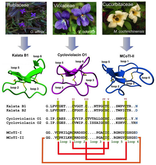 - Craik, D.J.; Malik, U. Cyclotide biosynthesis. Curr. Opin. Chem. Biol. 2013, 17, 546–554. [Google Scholar] [CrossRef]