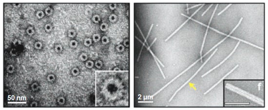 - Yonekura, K.; Maki, S.; Morgan, D.G.; DeRosier, D.J.; Vonderviszt, F.; Imada, K.; Namba, K. The bacterial flagellar cap as the rotary promoter of flagellin self-assembly. Science 2000, 290, 2148–2152. [Google Scholar] [CrossRef] [PubMed]
