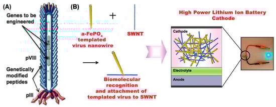- Lee, Y.J.; Li, H.; Kim, W.-J.; Kang, K.; Yun, D.S.; Strano, M.S.; Ceder, G.; Belcher, A.M. Fabricating genetically engineered high-power lithium-ion batteries using multiple virus genes. Science 2009, 324, 1051–1055. [Google Scholar] [CrossRef] [PubMed]