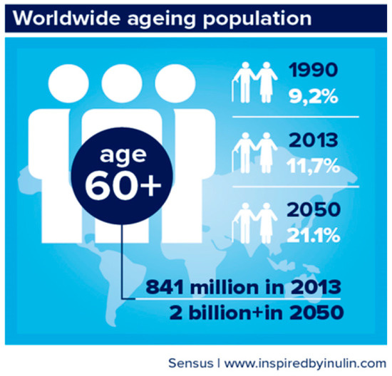 The increasing world population, which reached 7.5 billion by 2015 and is projected to increase to 9.7 billion by 2050 and 11.2 billion in 2100 [1], is a consequence of the fertility decline and improvement of human survival [2]. The global population aged 60 years or over totaled 962 million in 2017—more than twice the amount in 1980—is expected to double again by 2050. Thus, globally, the number of persons aged 80 years and over is expected to increase more than threefold between 2017 and 2050, rising from 137 million to 425 million (Figure 1 and Figure 2).