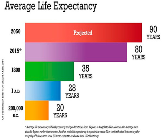 In 2050, older people are expected to account for 35% of the population in Europe, 20% in North America, 25% in Latin America and the Caribbean, 24% in Asia, 23% in Oceania, and 9% in Africa. In conclusion, life expectancy worldwide is projected to rise from 70 years in 2010–2015 to 77 years in 2045–2050, and eventually to 83 years in 2095–2100 (Figure 2).