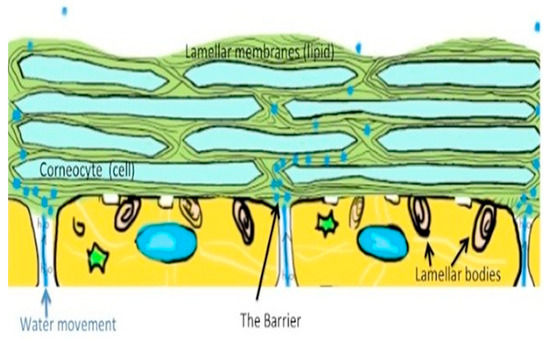 The skin barrier consists, in fact, of specific proteins and lipids known as the brick and mortar of the epidermis [7]. Bricks are the dead cells corneocytes, which are filled with a large protein complex, known as the cornfield envelop. The space between these cells is filled with lipids that form the mortar and are attached to the cornfield envelop by calcium that seems to represent a key formation of the barrier which modifies its structure during lifetime with aging (Figure 5) [8,9].