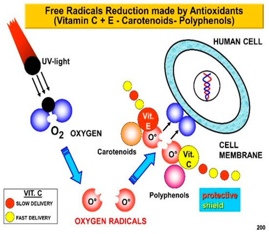 Desire for an everlasting beauty plays, therefore, an important role in our society, meaning women and men are looking for treatments to prevent skin aging phenomena by the use of innovative rejuvenation products and procedures [9,10]. For example, a combination of the right photo-protective agents, by the use of sunscreens and synergistic co-antioxidants, such as vitamins E and C and other natural ingredients such as lutein, applied topically and contemporary taken by oral route [11]. Their activity, in fact, may help to protect the skin cell membrane, avoiding the damage to the SC’ lipids and proteins occurring during lifetime, because of the pro-oxidative activity of free radicals (Figure 4) and may as well help to stimulate hair stem cells, as also reported by our studies [12].