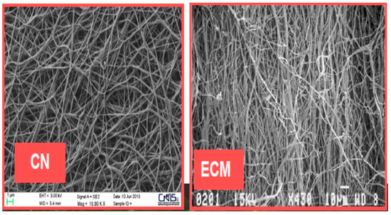Its morphology and physicochemical characteristics, in fact, facilitate its adhesion and dispersion in polymeric matrices, influencing the stress transfer into these nanocomposites [26,27,28,29]. Moreover, due to their bio-compostability, non-toxicity, biodegradability, biological activities, and tissue-film-forming capacities (characterized by their ECM-like structure when electrospun), chitin and chitosan are widely made use of in medicine, in cosmetics and in the food industry [14,15,16,17].
