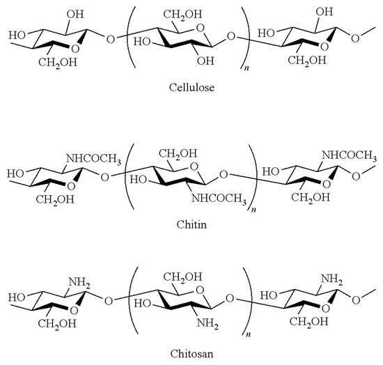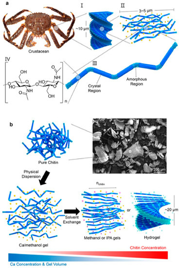 Chitin is a glucose-based and nitrogen-containing polysaccharide, widely distributed in nature as the principal component of the exoskeleton of crustaceans and insects as well as of cell walls of some bacteria and fungi [24]. After cellulose (to which it is structurally identical), it is the second most abundant biopolymer on earth, representing a resource of raw material estimated at about 100 billion tons/year [24,25].