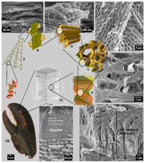 - Fabrius, H.O.; Sachs, C.; Triguero, R.P.; Raabe, D. Chitin-based ultrastructure influence of structural principles on the mechanics of a biological fiber-based composite material organization: The exoskeleton of the lobster Homarus americanus. Adv. Mater. 2009, 22, 391–400. [Google Scholar] [CrossRef]