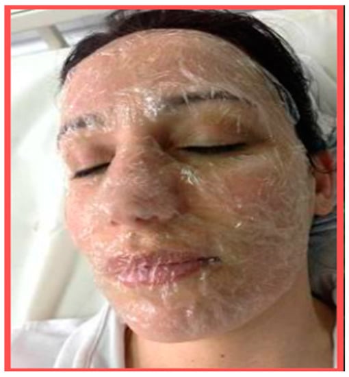These tissues, made of polysaccharide-natural fibers obtained from waste materials, may be used as innovative carriers for the manufacturing of different cosmetic products, characterized by the proper and selected active ingredients they contain. Thus, for example, it will be possible to produce innovative anti-aging beauty masks (Figure 11) bounding for example antioxidants and immunomodulating compounds to the tissue fibers. With this new technology, it will be possible to produce innovative and smart cosmeceuticals without the use of preservatives, emulsifiers, and other chemical agents, as previously reported by the PolyBioSkin project. These tissues, in fact, could be made through electrospinning or casting technologies, and if packed and distributed in a dry state, they may be free of water and any chemicals such as preservatives and/or emulsifiers, fragrances, colors, and other chemicals often causing allergic or sensitizing reactions.