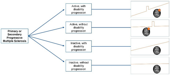 - Lublin, F.; Stephen, C.; Reingold, P.; Cohen, J.A.; Cutter, G.; Sørensen, P.S.; Thompson, A.J.; Wolinsky, J.S.; Balcer, L.J.; Banwell, B.; et al. Defining the clinical course of multiple sclerosis: The 2013 revisions. Neurology 2014, 83, 278–286. [Google Scholar] [CrossRef]