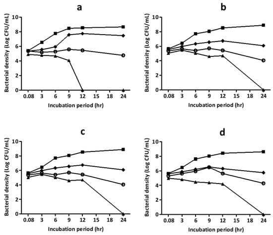 The complete randomized design was used, and all the experiments were performed in triplicates and three independent times. One-way analysis of variance (ANOVA) was performed using Minitab statistical software (Version 17.0, Minitab Inc., State College, PA, USA). Tukey’s test was used to determine the differences among treatments, and significant differences were defined as p < 0.05, and the results were expressed as the mean ± standard deviation. The time to kill curves were plotted using GraphPad Prism version 5.0 for Windows (GraphPad Software, La Jolla, CA, USA).