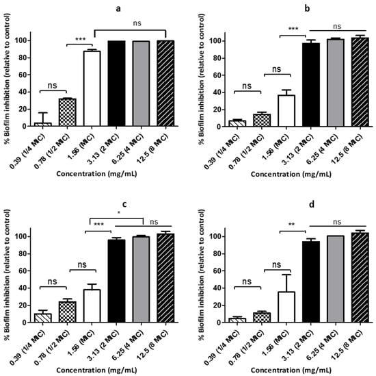 Inhibition of biofilm formation of Streptococcus pyogenes 19615 by hot water infusions at various concentrations. (a) licorice roots, (b) barberry roots, (c) oregano flowering shoots, and (d) thyme flowering shoots. Each data point represents mean ± SD from three independent experiments performed in triplicate.