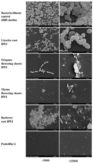 Scanning electron micrographs of biofilms of Streptococcus pyogenes formed on the microplate surface with the presence of hot water infusions of licorice roots, oregano flowering shoots, thyme flowering shoots, barberry root and penicillin G at their sub-inhibitory concentrations. HWI, hot water infusion.