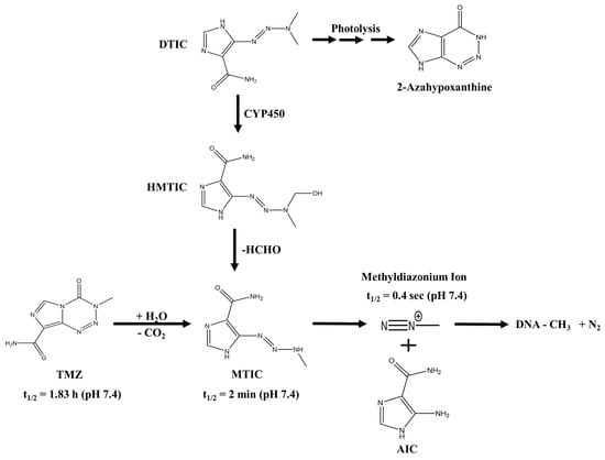 Prodrug activation of TMZ and DTIC. DTIC requires oxidative N-demethylation via CYP450 enzymes, giving rise to HMTIC. HMTIC then eliminates formaldehyde and forms MTIC. TMZ, in contrast, is spontaneously hydrolyzed to MTIC at neutral or alkaline pH. Thereafter, DTIC and TMZ share the same pathway. MTIC further fragments to AIC and the methyldiazonium ion, which in turn reacts with nucleophilic sites, for example, in the DNA. In addition, DTIC can be activated by photolysis, yielding 2-azahypoxanthine. Abbreviations: AIC, 5-aminoimidazole-4-carboxamide; CYP450, cytochrome P450; DNA, deoxynucleic acid; DTIC, dacarbazine; HMTIC, 5,3-hydroxy,ethyl-3-methyl-triazene-imidazole-carboxamide; MTIC, 5-(3-methyltriazen-1-yl)-imidazole-4-carboxamide; TMZ, temozolomide. Based on [18,32].