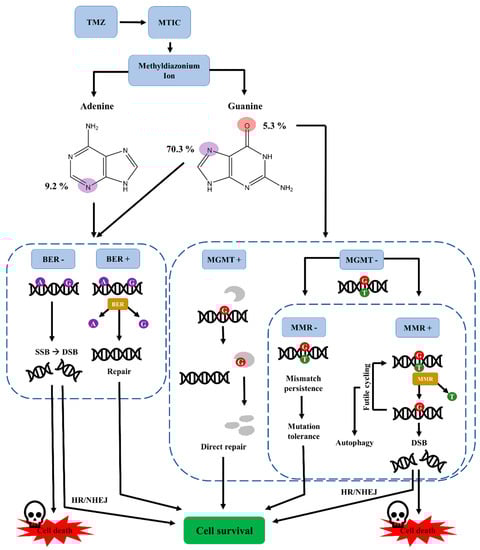 N7-methylguanine, which is prone to spontaneous depurination that forms toxic and mutagenic sites, and N3-methyladenine, which is per se highly toxic by blocking DNA polymerase, are easily repaired via BER [8,9,47,48]. Therefore, it is assumed that these lesions contribute much less to the cytotoxic effects. In contrast, O6-methylguanine, representing only a small fraction of all methylations, is considered to be particularly genotoxic and cytotoxic when mismatch repair is functional [28,49]. Figure 2 summarizes the proposed effects TMZ has on the cellular DNA.