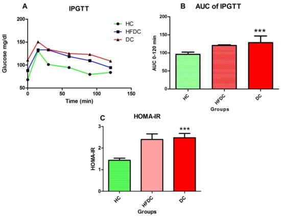 Figure 1A,B demonstrates variations in glucose levels and area under curve (AUC) after IPGTT. After eight weeks, IPGTT and HOMA-IR were assessed from all experimental groups. Healthy control rats showed faster serum glucose clearance than HFDC and DC rats. HFDC and DC rats exhibited higher serum glucose levels at 0 and 120 min as compared to the healthy control rats. HFDC and DC also showed significant increases in AUC compared to HC (p ≤ 0.01 for HFDC; p ≤ 0.001 for DC) groups.