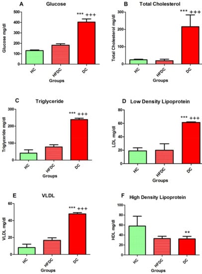 Diabetic rats showed elevated serum glucose and lipid profile. (A) Serum glucose levels; (B) Serum total cholesterol levels; (C) Serum triglyceride levels; (D) Serum low density lipoprotein levels; (E) Serum VLDL levels; (F) Serum high density lipoprotein levels. Results are recorded as a mean of three replicates and denoted as mean ± SD (n = 6 animals per group). ** p ≤ 0.01 and *** p ≤ 0.001, healthy control group; +++ p ≤ 0.001, HFD control group; (Dunnett’s Multiple Comparisons Test). HC: Healthy control, HFDC: High fat diet control, DC: Diabetes control. VLDL: Very low-density lipoprotein.