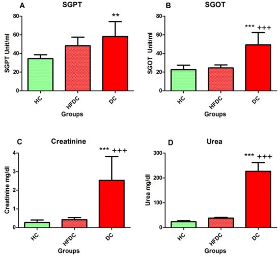 Figure 3A,B shows liver function tests of HC, HFDC and DC groups. DC group showed significantly (p ≤ 0.01) increased serum glutamic pyruvic transaminase (SGPT) levels as compared to the HC and HFDC groups. In addition, serum glutamic oxaloacetic transaminase (SGOT) levels increased in DC as compared to HC (p ≤ 0.001) and HFDC groups.