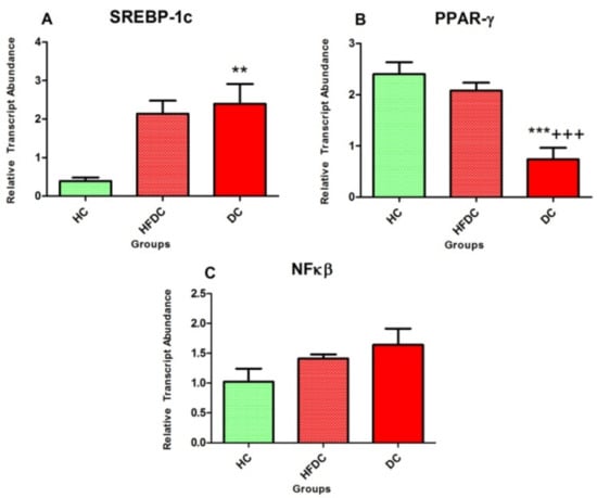 Alteration in transcription factors expression results in lipid abnormalities. Animals from the HC group were fed normal diet while HFDC and DC groups were on high fat diet. DC group was treated with STZ 35 mg/kg b.w. (ip). (A–C) represent the expression profiles of transcription factors SREBP-1c, PPAR-γ and NFκβ genes, respectively. Results are denoted as mean ± SD (n = 3 and the reactions were performed in duplicates). ** p ≤ 0.01 and *** p ≤ 0.001 when compared with the HC group and +++ p ≤ 0.001 when compared with the HFDC group (Dunnett’s multiple comparison test). HC: Healthy control, HFDC: High fat diet control, DC: Diabetic control group-treated STZ, SREBP-1c: Sterol Regulatory Element Binding Proteins-1c, PPAR-γ: Peroxisome Proliferator-Activated Receptor Gamma, NFκβ: Nuclear Factor-κβ.