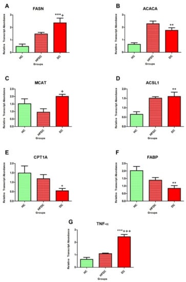 Expression profile of fatty acid metabolism genes is depicted in Figure 5A–F. In diabetic rats, the expression levels of FASN were significantly up regulated by ~4.9 and ~1.6 fold as compared to HC (p ≤ 0.001) and HFDC (p ≤ 0.05) rats, respectively. In DC animals, ACACA gene expression increased by ~2.8 fold as compared to HC (p ≤ 0.01), while it decreased by ~0.7 fold as compared to the HFDC animals.