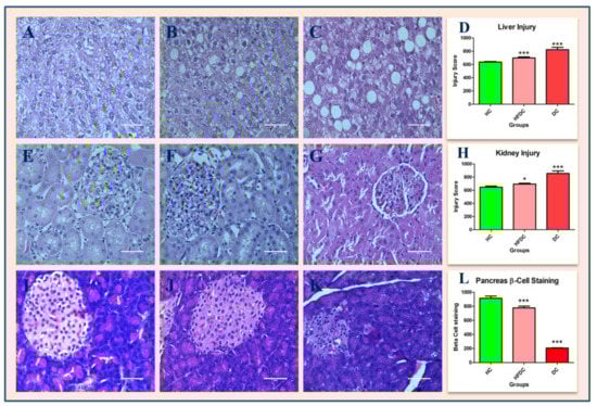 Histopathological examination of liver, kidney and pancrease tissues (40×, Scale bar = 50 µm). Histology of liver of healthy control (A), High fat diet (B), Diabetic control (C) and Liver injury (D); kidney of healthy control (E), High fat diet (F), Diabetic control (G) and kidney injury (H) and pancrease of healthy control (I), High fat diet (J), Diabetic control (K) and Beta cell staining. Tissue injury and beta cell staining data graphically expressed as mean ± SD and compared using Dunnett’s multiple comparison test against a healthy control (* p≤ 0.05 and *** p ≤ 0.001) (D,H,L).