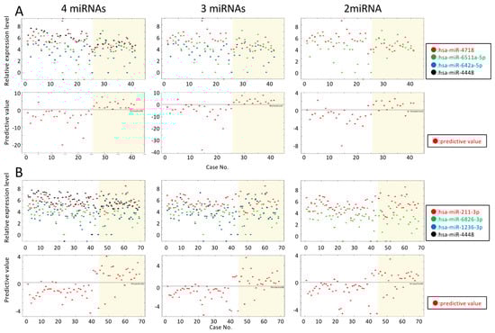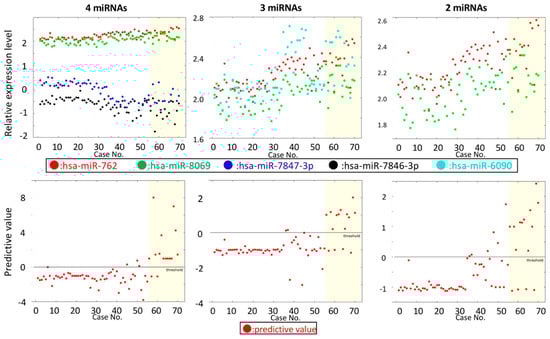 Vertical axis, miRNA relative expression level and class (1, no recurrence; 2, recurrence); horizontal axis, case. Upper panel: Relative miRNA expression level. Lower panels: Vertical axis, the predictive value calculated by the indicated equation (Table 1). Horizontal line (value = 0), threshold. Dots, predictive values were yielded individually by the indicated equation (Table 1). Four fractions divided by the threshold value and recurring HCC (yellow) and non-recurring HCC (white); lower left and lower right fractions show expected results, and upper left and lower right fractions show unexpected results.