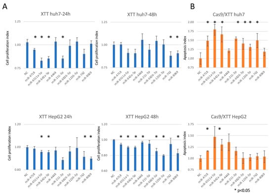 Functions of the miRNAs in cell proliferation and apoptosis. (A). Cell proliferation index in Huh7.5 and HepG2 cells 24 and 48 h after miRNA transfection. NT and TF, non-treatment and transfection reagent only, respectively. (B). Apoptosis assay by caspase-9 activity normalized to XTT incorporation in Huh7.5 and HepG2 cells 6 h after miRNA transfection. Data are the means ± SD of three independent experiments. Asterisks denote a significant difference (p < 0.05).