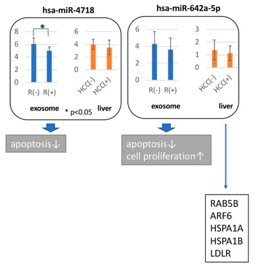 To show the biological significance of miRNA used for hepatocarcinogenesis prediction, the target genes of miRNAs were clarified. The point we noted was that miRNA expression information of exosomes was used for prediction; however, miRNA did not control the target genes in the exosomes. We identified common expression patterns of HCC-related miRNAs in exosomes and liver tissue. Four (miR-4718, 642a-5p, 6826-3p, and 762) of nine miRNAs had similar expression patterns in exosomes and the liver. Downregulation of miR-642a-5p induced cell proliferation and down-regulation of miR-4718 and 642a-5p inhibited apoptosis in vitro. Down-regulation of miR-4718, 6823-3p, and 762 showed cell growth by observing one point of one cell line, respectively. Down-regulation of miR-6826-5p and miR-762 showed apoptosis induction in Huh7.5 in vitro. The downregulation of miR-642a-5p: (1) induced cell invasion by altering the expression of ARF6 [23]; (2) promoted tumor growth by influencing the expression of HSPA1, HSPA1B, and LDLR [24]; and (3) promoted cell proliferation by modulating the expression of RAB5B [25]. Thus, multiple miRNAs play synergistic roles in carcinogenesis (Figure 5).