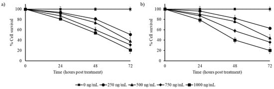 Effect of stilbene-rich muscadine grape extracts on the cytotoxicity of HCC1806 cells; (a) Pineapple and (b) Southern Home cultivars. Cells were treated with different concentrations (0–1000 ng/mL) of stilbene-rich extracts from the berries of the two cultivars. The extracts induced differential cytotoxic response in HCC1806 triple negative breast cancer cells. More than 50 h was required to kill 50% of cells by the highest concentration (1000 ng/mL) of the extracts tested.