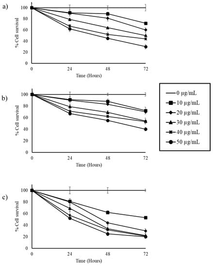 The cytotoxicity assay was performed according to the method by Mosmann [20] with modifications. Confluent cells were seeded into three 96-well plates at 1 × 105 cells/mL and incubated for 24 h in a humidified atmosphere of 5% CO2 at 37 °C. Cells were treated with serum-free medium containing varying concentrations of extracts dissolved in DMSO. The volume of DMSO was maintained not to exceed 2% v/v per well, and a DMSO treatment group was also maintained as control. Cells were then incubated in a humidified atmosphere of 5% CO2 at 37 °C. Cell viability was assessed using the Bio-Rad TC-20 automated cell counter at 24, 48, and 72 h. Results are expressed as percentage cell viability in comparison to the untreated control.