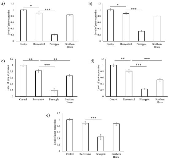 Effect of stilbene-rich muscadine grape extracts on the tumor-promoting genes in HepG2 cells. (a) Bcl2, (b) EGFR, (c) VEGF, (d) cdk, and (e) ybx1. Stilbene-rich extracts (1 µg/mL) muscadine grape cultivars, Pineapple and Southern Home, were found to significantly downregulate the expression of the tumor-promoting genes. Resveratrol (50 µg/mL) was found to have marginal repression of these genes, but was less effective than the berry extracts, even at a 50-fold higher dose. (* p < 0.05; ** p < 0.005; *** p < 0.0005).