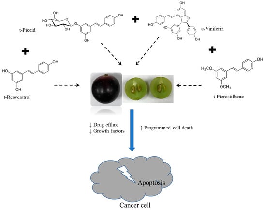 Figure showing the effect of stilbene-rich muscadine grape extract in cancer cells. The synergistic action of stilbenes present in muscadine grape berries reduces drug efflux, reduces cancer cell growth, and activates programmed cell death to kill the cancer cells. (↑ — upregulation; ↓ — downregulation)